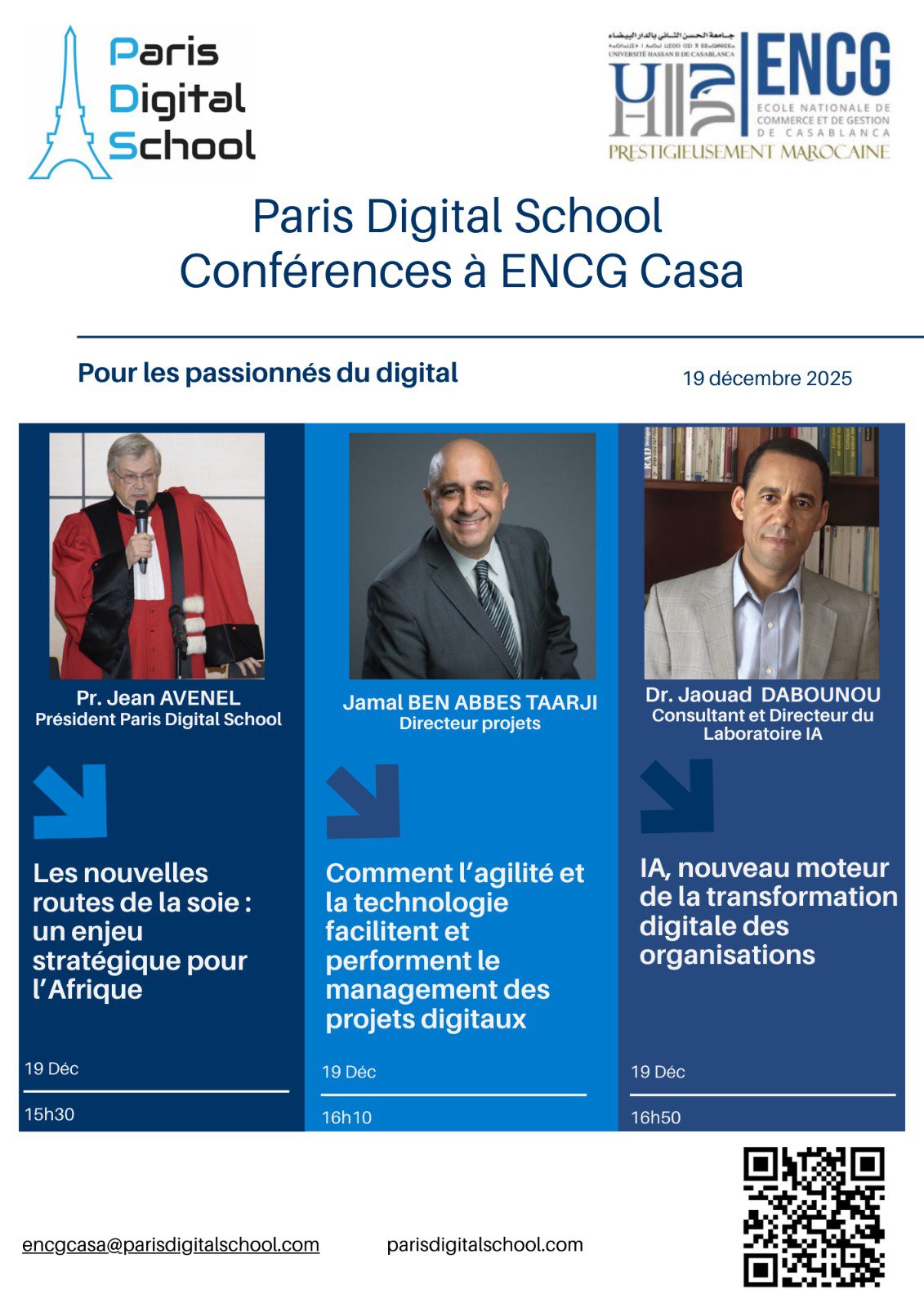 L’ENCG Casablanca a le plaisir d’accueillir Paris Digital School pour une série de conférences exceptionnelles autour de la transformation digitale et du management des projets, le 19 décembre 2025.