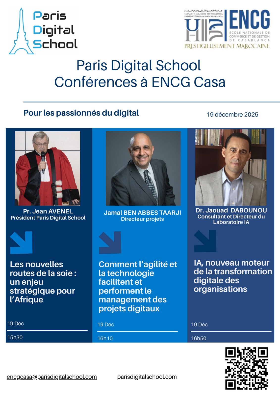 L’ENCG Casablanca a le plaisir d’accueillir Paris Digital School pour une série de conférences exceptionnelles autour de la transformation digitale et du management des projets, le 19 décembre 2025.